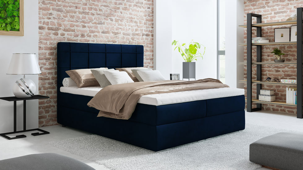 Materac wykonany jest ze sprężyny BONELL i pianki T30 (średnio twardej). Stelaż wykonany z p łyty meblowej i litego drewna. Dwa pojemniki na pościel otwierane z boku. Topper na materac górny wykonany z pianki wysoko elastycznej. Grubość toppera wynosi 5 cm. Wezgłowia - dostępne w 4 różnych wersjach do wyboru w tej samej cenie. Możliwość wyboru tkaniny (pracujemy na trzech grupach cenowych tkanin).
